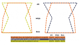 Tenemos una población claramente polarizada, que podemos mostrar de una manera gráfica con la figura de un reloj de arena, donde la franja ancho de las partes superior e inferior, se corresponderían al nivel de formación alto y bajo que predominan en la población activa catalana, y la franja central, mucho más estrecha, sería la correspondiente a los estudios de nivel medio.